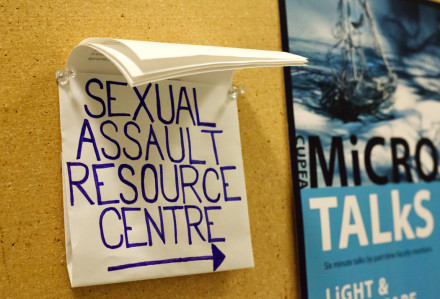 A piece of scrap paper with the words, “Sexual Assault Resource Centre” written on it, along with a directive arrow, is posted to a corkboard adjacent to the elevator.