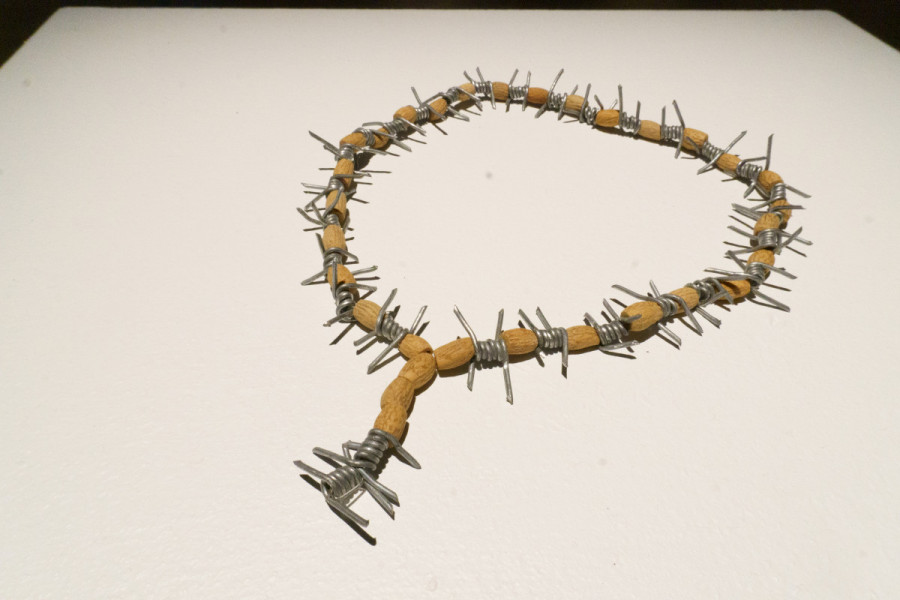 One of the artists, Khaled Jarrar, created a piece confronting the brutal conditions Palestinian political prisoners are forced to endure in Israeli jails. His work showcases a set of prayer beads made of barbed wire, olive pits and rope.