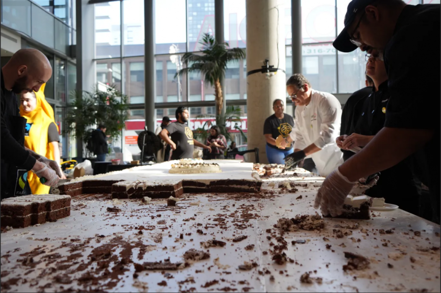 The cake measured 16ft by 6ft and was packed with 181 kg of bananas, 4.5 to 5.4 kg of cocoa powder and 100 kg of Fairtrade chocolate chips. The record-sized bake served 3,000 portions, 2,200 being served in EV and 800 being donated to the Hive Free Lunch program at the Loyola campus to ensure both campuses received slices.
