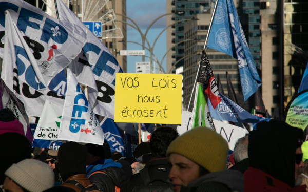 On Oct. 26, a day after the bill was announced, around 300 health practitioners gathered at the Maison de Radio-Canada building to protest the new bill.