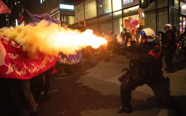 As the evening progressed, the crowd thinned but police presence grew aggressively. Bike cops made way for riot cops armed with pepper spray as police closed in on protesters. By this point, families with children appeared to have left the march.