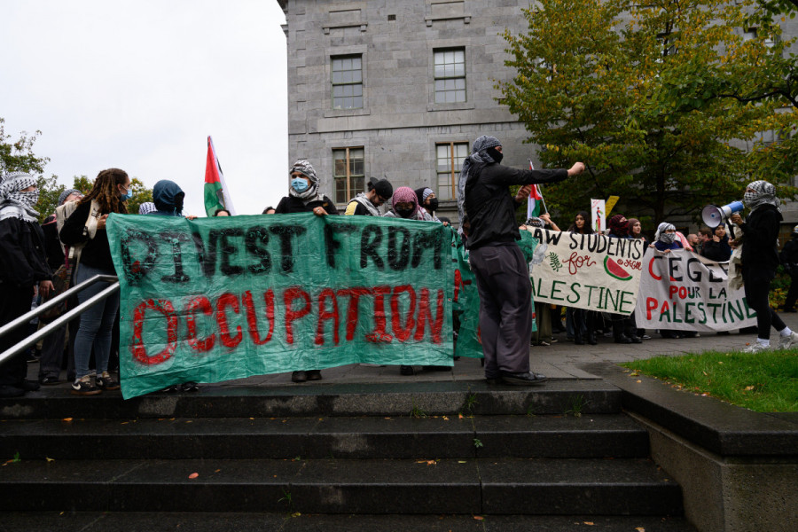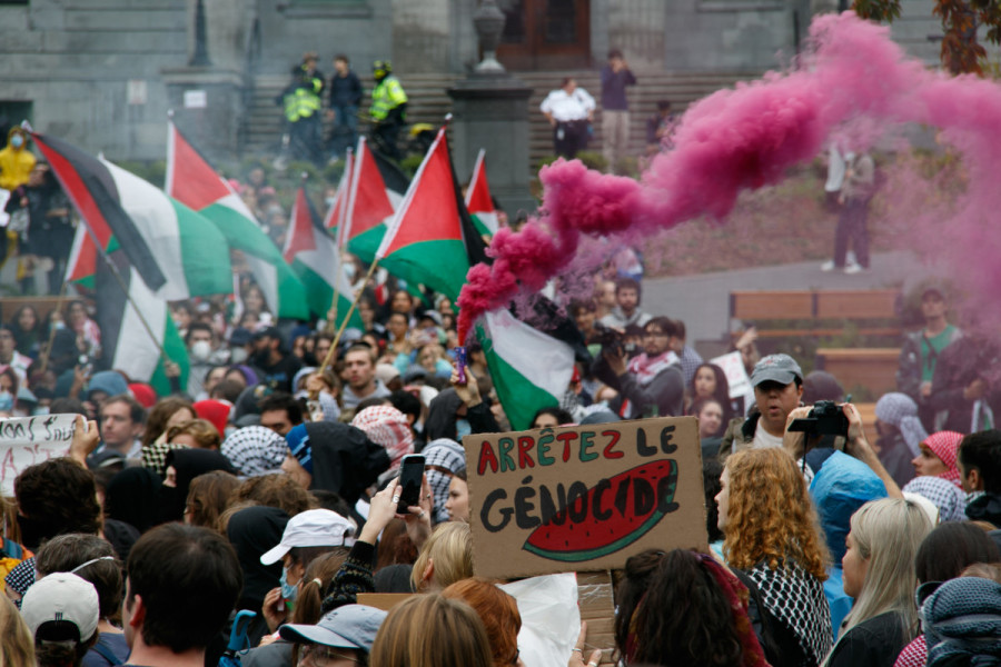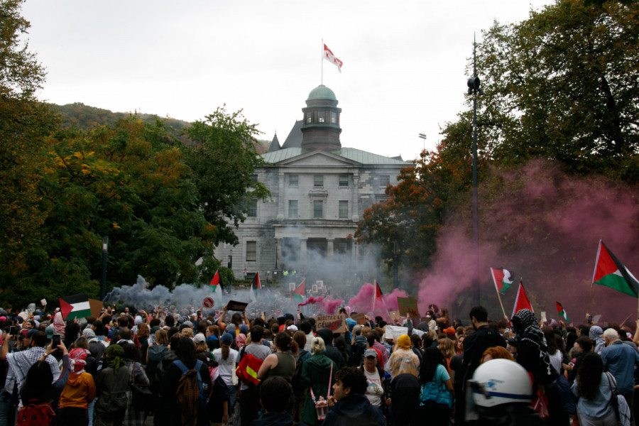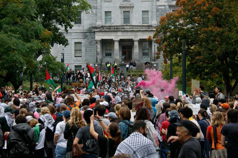 Soon after, students gathered to listen to more speeches from activists in front of McGill’s McCall MacBain Arts Building. Protesters lit smoke bombs in the colours of the Palestinian flag and set fire to an Israeli flag.