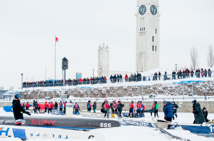 In the sixth edition of le Défi de canot à glace at the Quai à l’Horloge, teams maneuver their 10-meter-long canoe for several kilometers to cross the finish line in under two and a half hours. The endurance required for this race is challenging, so the five team members take turns paddling to be able to have stamina for the duration of the race.