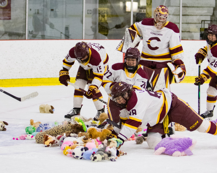 The win came on the night of Concordia’s annual Teddy Bear Toss, where hundreds of bears were thrown onto the ice after the Stingers’ first goal, scored by forward Ekaterina Pelowich.