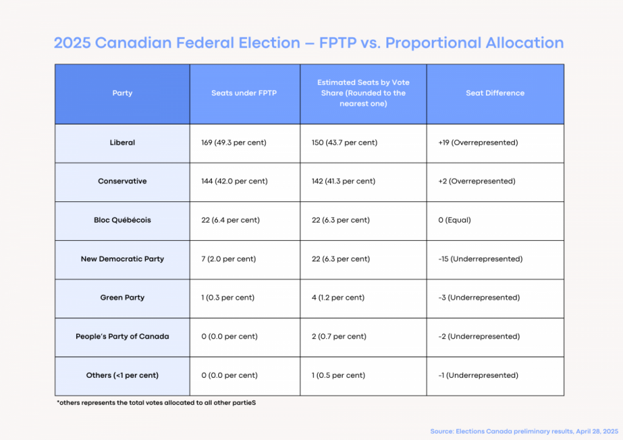 The 2025 election made this clear. The Liberals won 5.5 per cent more seats than their popular vote, yet the Conservatives gained 0.7 per cent more seats, while the NDP took 4.3 per cent fewer seats than their actual share of the popular vote.
