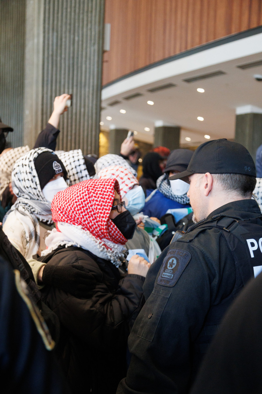 After demonstrators entered the ground floor of the Hall building at 12:45 p.m., CSPS agents formed a line blocking a group of around a dozen demonstrators.