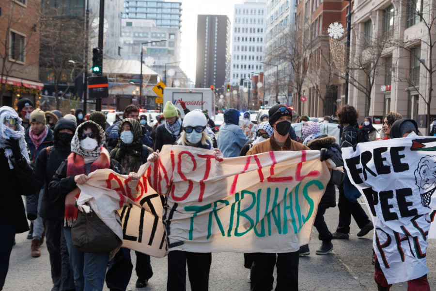 At around 1:30 p.m., police corralled the group in front of the Hall building doors, stringing orange tape between the building’s pillars. Demonstrators then flooded down De Maisonneuve Blvd. W.