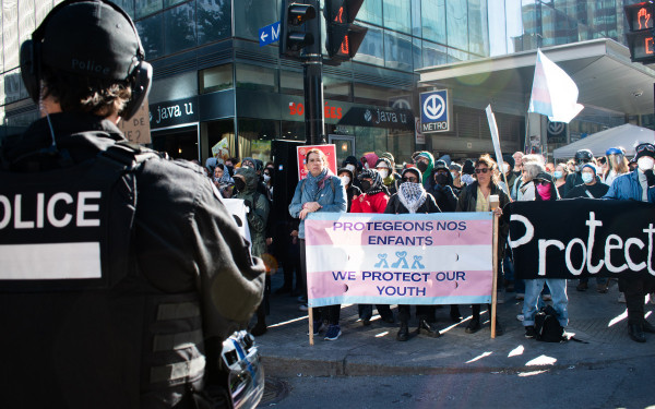 Hundreds of counter-protesters show up to defend the rights of trans youth in Montreal on Sept. 20.