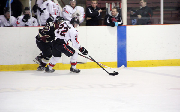 Stingers right-winger Alexandre Monahan tries to steal the puck from Carleton Ravens forward Ryan Berard during last Saturday’s game. The Stingers fell to the Ravens 3-2, with head coach Kevin Figsby citing a lack of consistent effort as the reason for the loss.